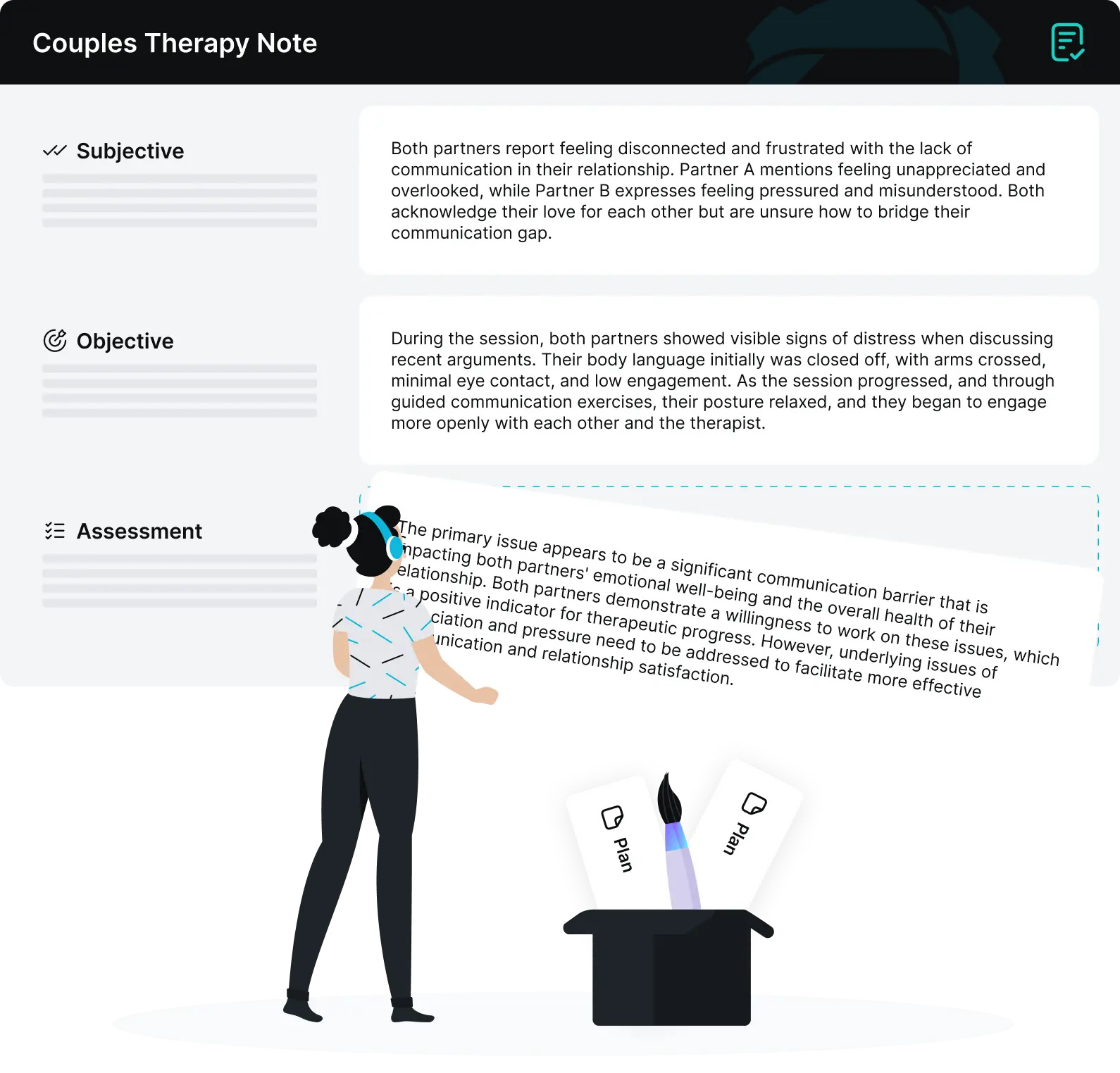 - Documenting Interactions and Dynamics: During the session, significant interactions and dynamics between the partners are observed. AutoNotes can help organize and categorize these observations efficiently, but it is the therapist’s responsibility to accurately capture and input the essence and specifics of these interactions based on their professional assessment.